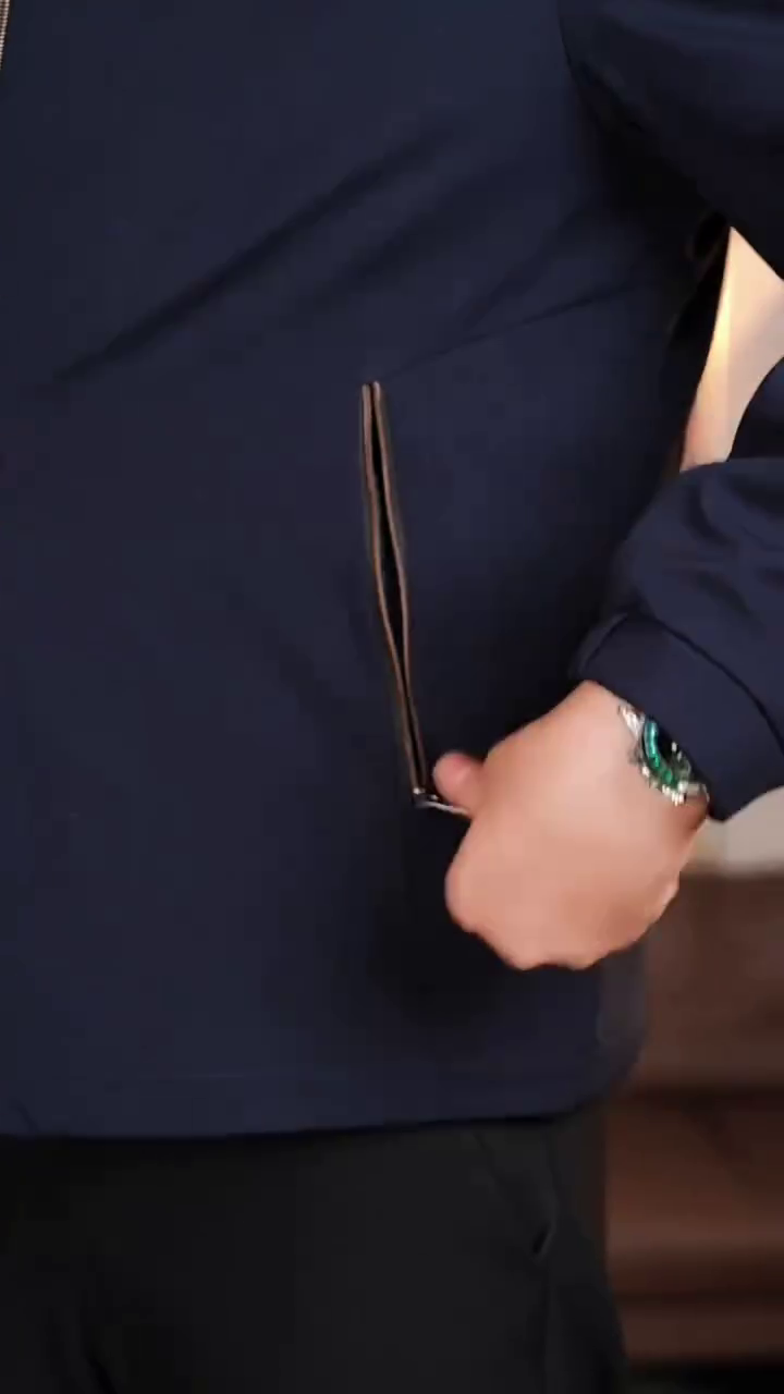 • Contrast Trim: Notice the faint, likely brown or tan piping/trim along the zipper and collar edge, adding a subtle touch of premium contrast.