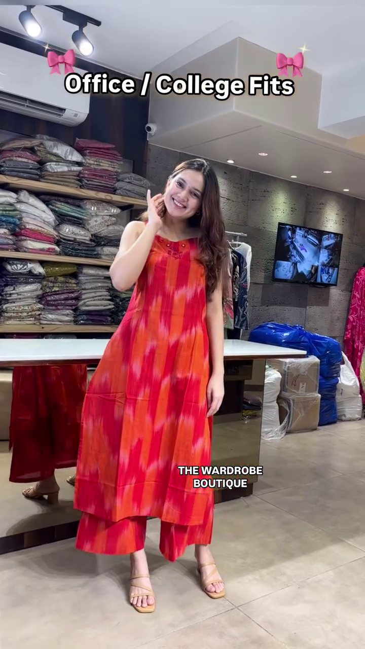 Each set features a beautifully tailored straight-fit kurta with a clean neckline and minimal detailing, giving it a polished and sophisticated look. The ikat-inspired print adds subtle texture and charm, making it stylish yet professional. Paired with matching wide-leg palazzo pants, this outfit offers a relaxed silhouette that allows easy movement throughout the day.